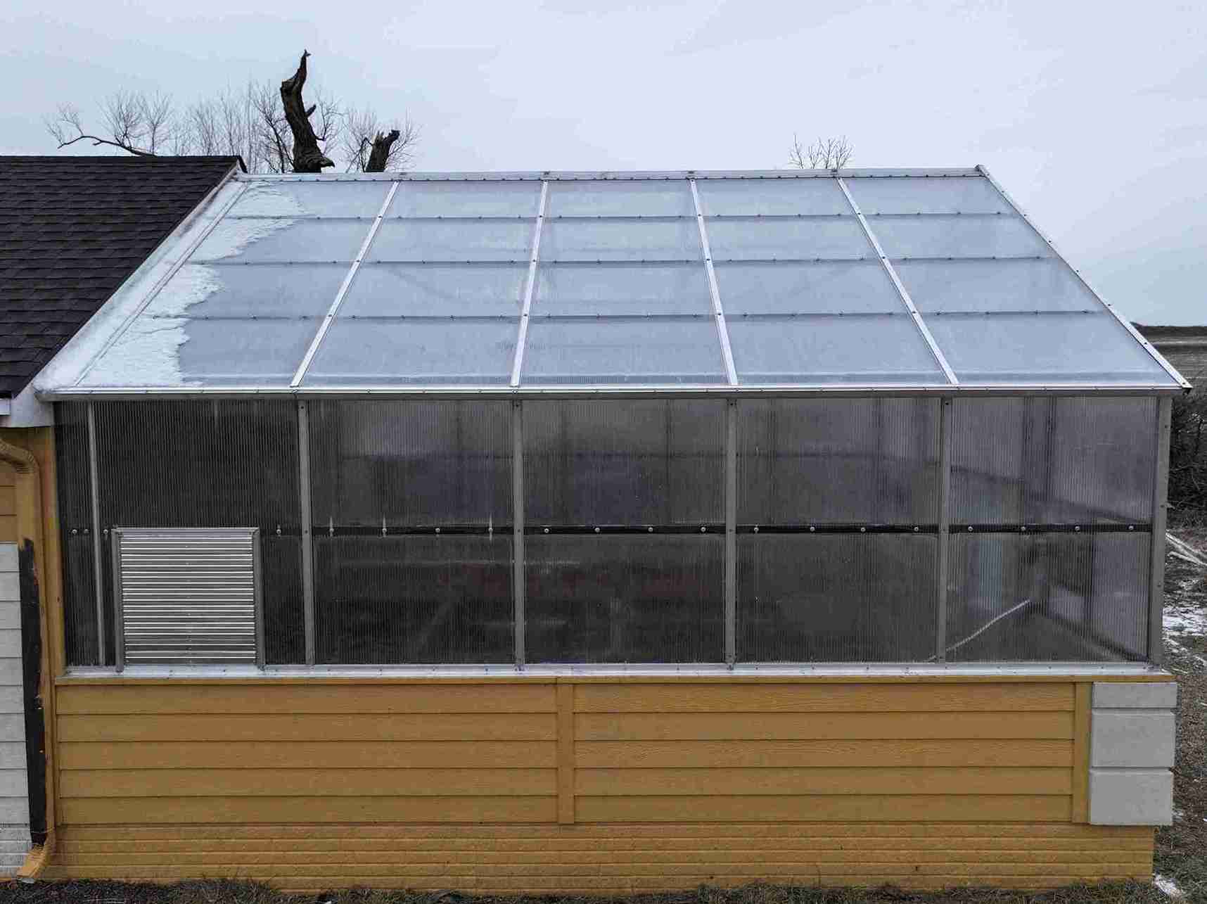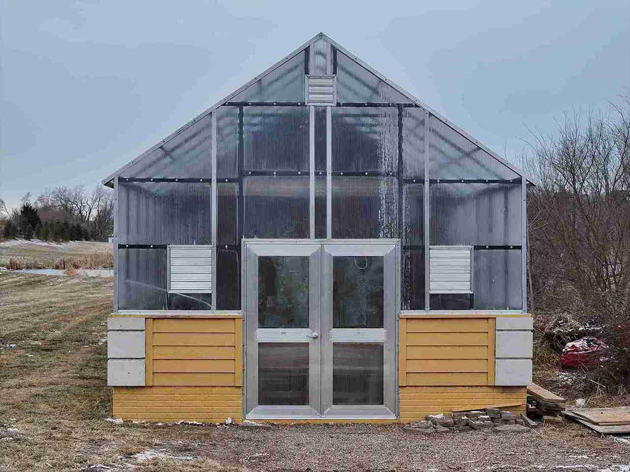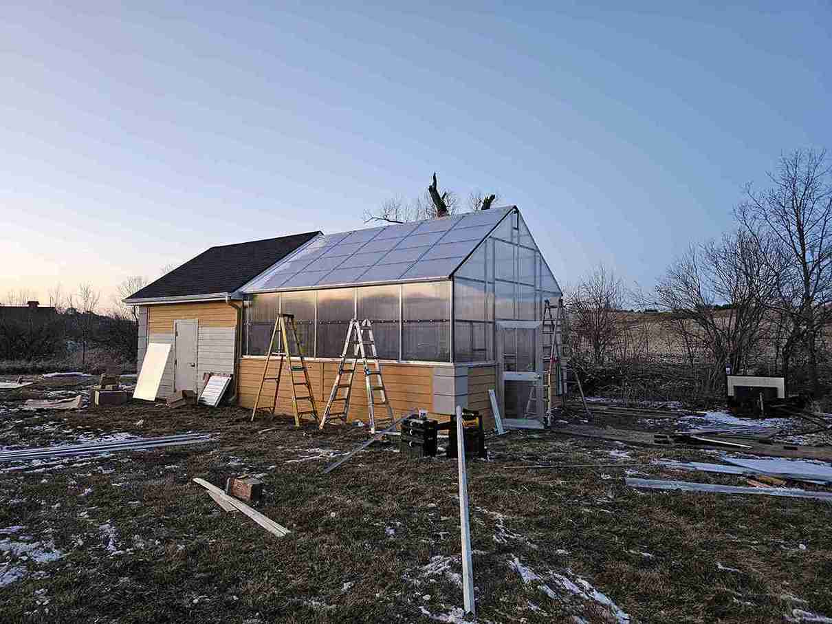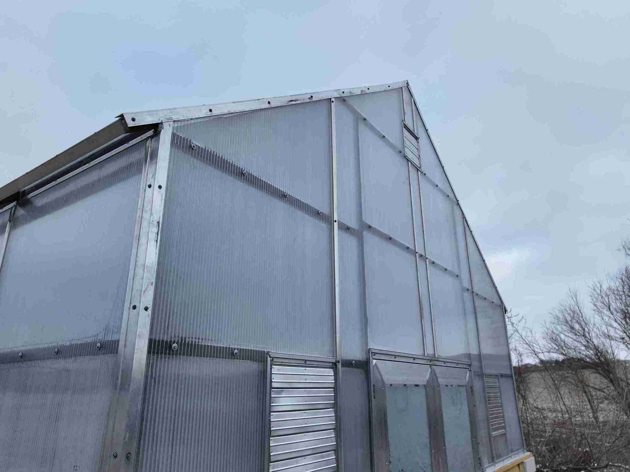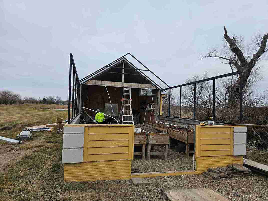 In a small development in Bennington, the tornado damaged homes and destroyed a small greenhouse attached to an outbuilding. The contractor in charge of repairing the home on this property contacted Quality Structures to rebuild the greenhouse. Due to the non-standard size, and the need to match the profile of the existing building, Quality Structures built the greenhouse from scratch, pre-fabricating and welding the walls and trusses off-site. The roof is sheeted in polycarbonate while the sidewalls are sheeted in twin-wall acrylic panels for increased light transmission. Finishing off the build is a beautiful aluminum double hung door from HC Quality Doors