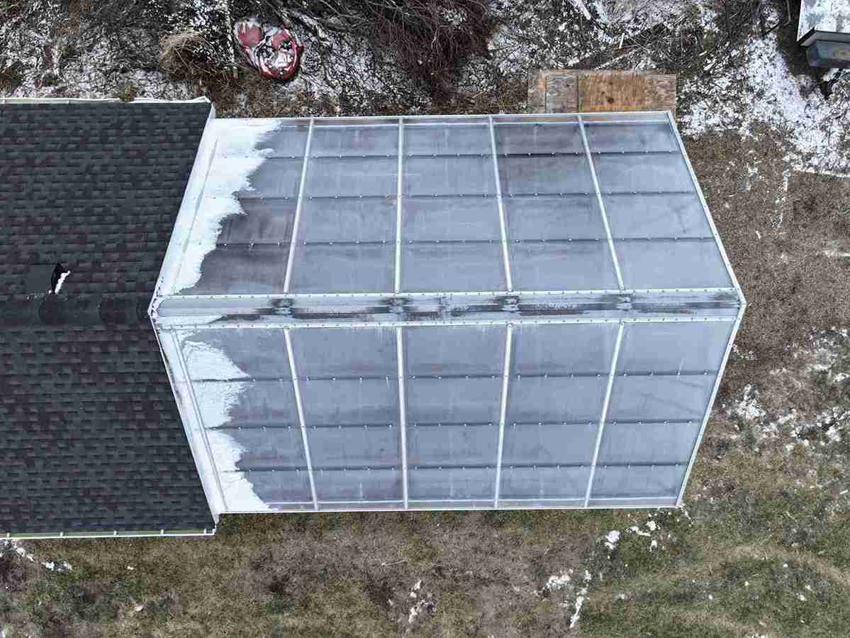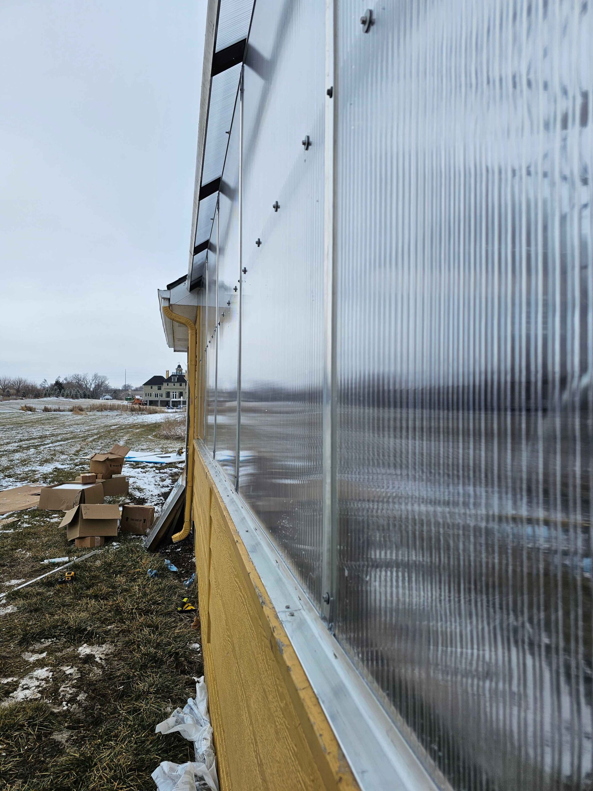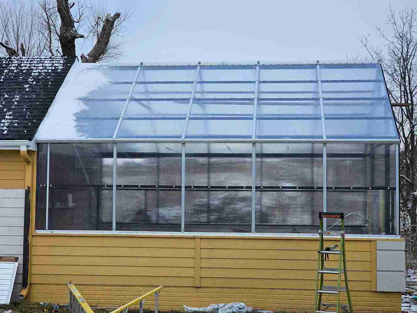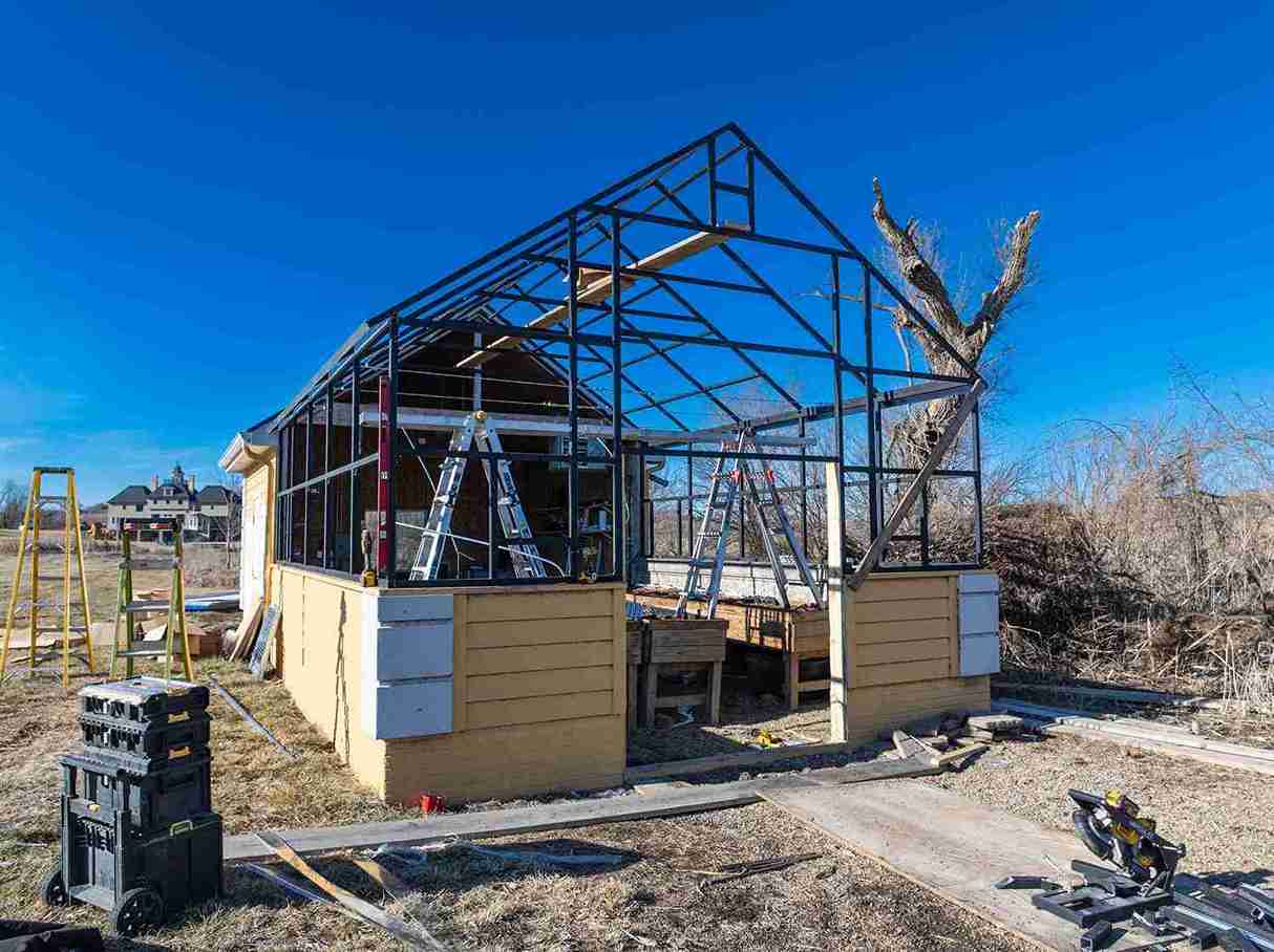 In a small development in Bennington, the tornado damaged homes and destroyed a small greenhouse attached to an outbuilding. The contractor in charge of repairing the home on this property contacted Quality Structures to rebuild the greenhouse. Due to the non-standard size, and the need to match the profile of the existing building, Quality Structures built the greenhouse from scratch, pre-fabricating and welding the walls and trusses off-site. The roof is sheeted in polycarbonate while the sidewalls are sheeted in twin-wall acrylic panels for increased light transmission. Finishing off the build is a beautiful aluminum double hung door from HC Quality Doors