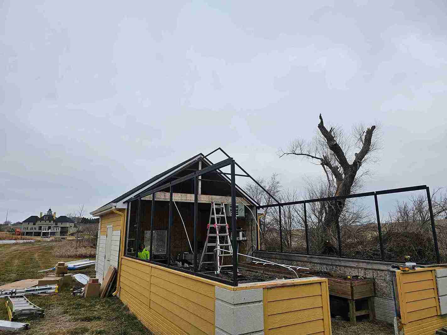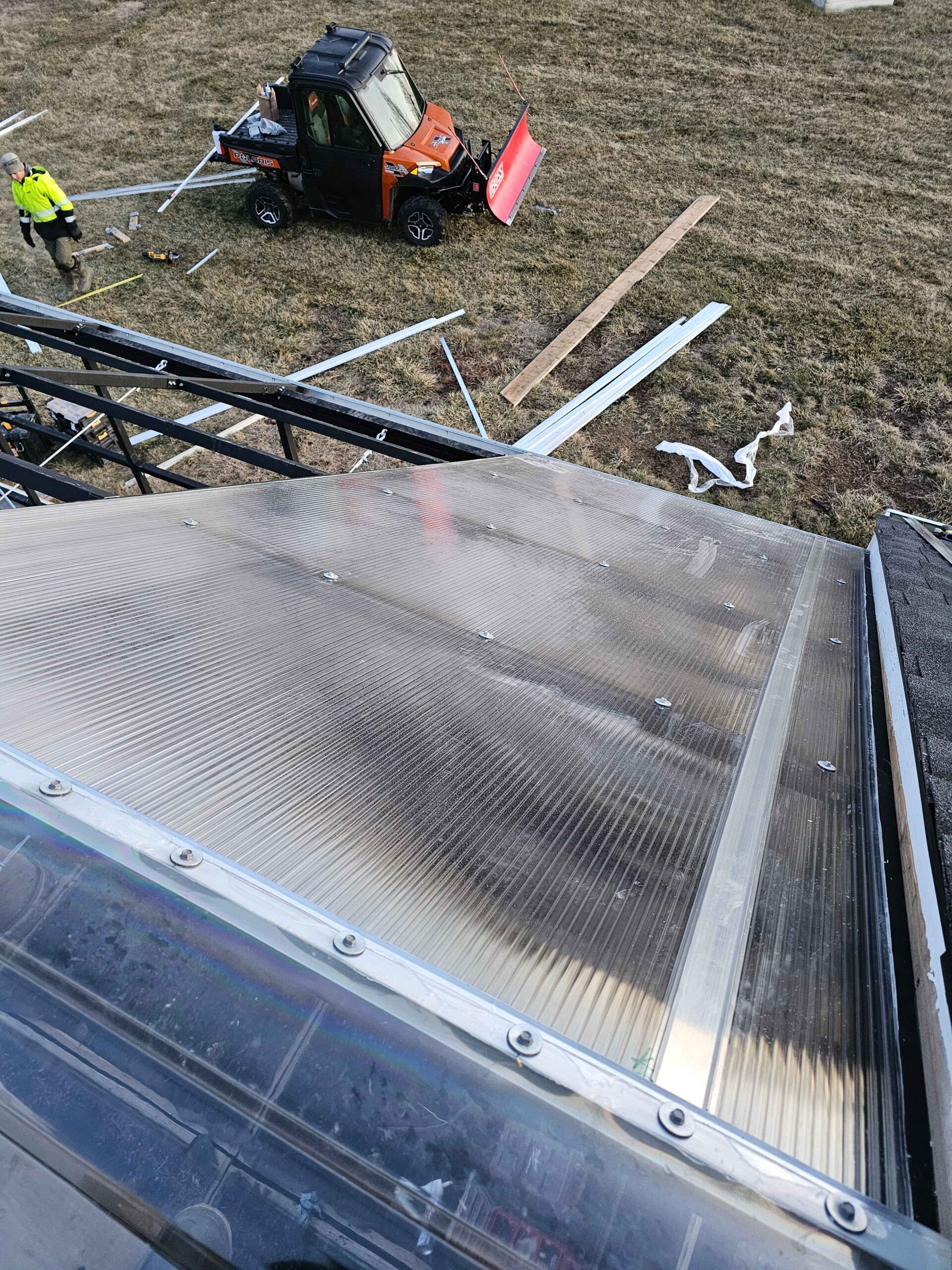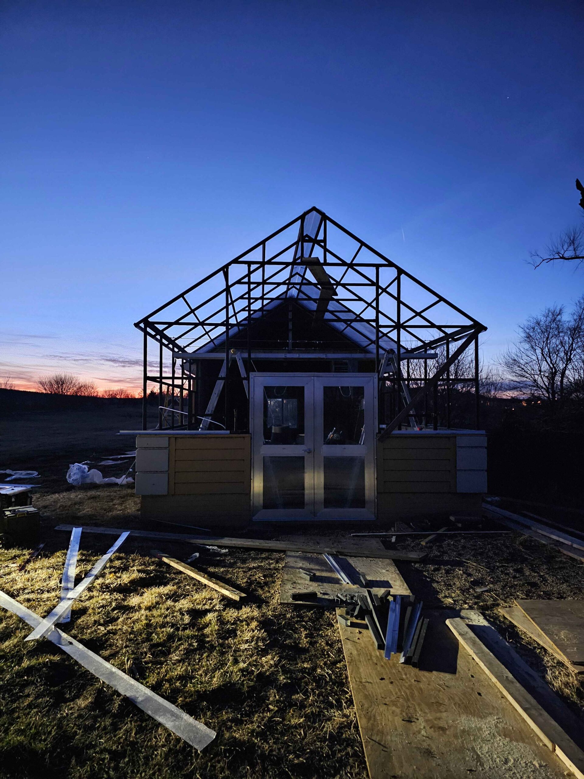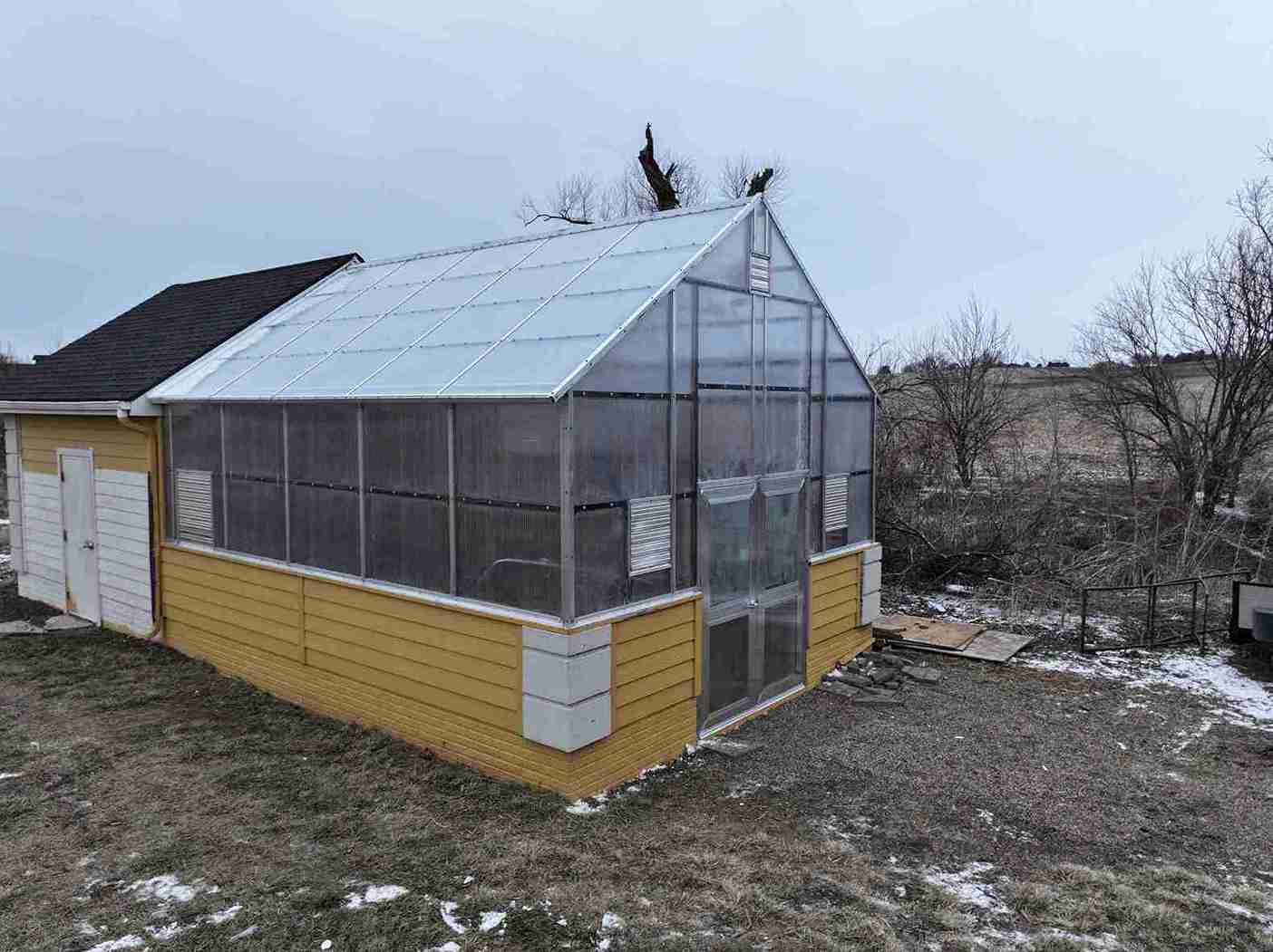 In a small development in Bennington, the tornado damaged homes and destroyed a small greenhouse attached to an outbuilding. The contractor in charge of repairing the home on this property contacted Quality Structures to rebuild the greenhouse. Due to the non-standard size, and the need to match the profile of the existing building, Quality Structures built the greenhouse from scratch, pre-fabricating and welding the walls and trusses off-site. The roof is sheeted in polycarbonate while the sidewalls are sheeted in twin-wall acrylic panels for increased light transmission. Finishing off the build is a beautiful aluminum double hung door from HC Quality Doors